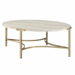 A contemporary two-piece coffee table set brings luxury and glamour to your home. Arched braces and T-legs in a champagne finish support lush faux marble tabletops on an oval coffee table and round end table, perfect for the ultimate in welcoming sophistication.