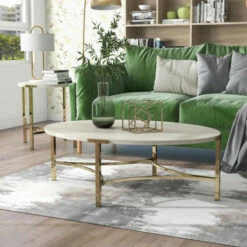 A contemporary two-piece coffee table set brings luxury and glamour to your home. Arched braces and T-legs in a champagne finish support lush faux marble tabletops on an oval coffee table and round end table, perfect for the ultimate in welcoming sophistication.