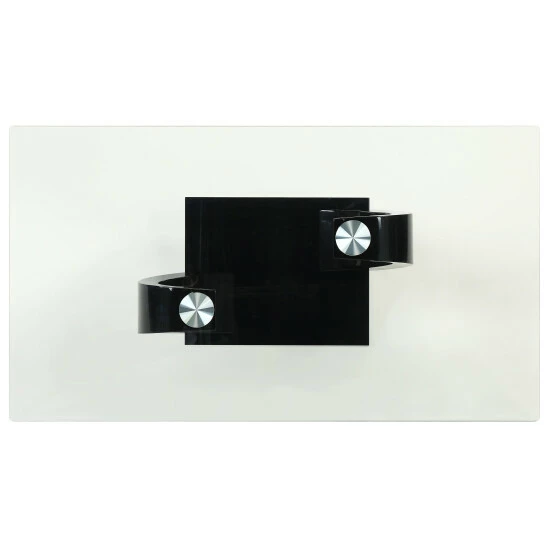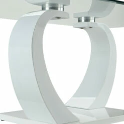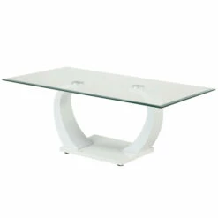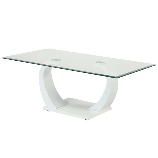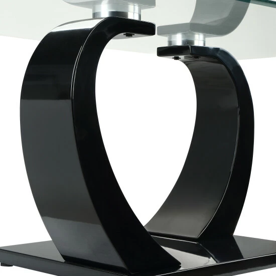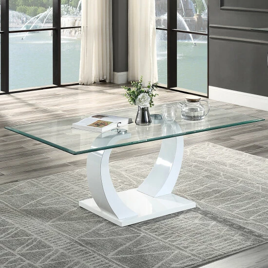 Graceful curves create an elegant, sculpted look for this contemporary glass coffee table. A beveled edge complements the clear glass tabletop, ensuring airy appeal in your living room. The wave-like double pedestal base adds a sleek, glossy finish for a clean, sophisticated presentation.