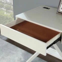 Revamp your workspace with the sophistication of this two-drawer writing desk. Bold X-cross legs are angled inward to create its eye-catching presentation and felt-lined drawers add a spot to stash pens and paper. A power panel on the desktop adds outlets and USB ports, perfect for everything from your laptop to your smart speaker.