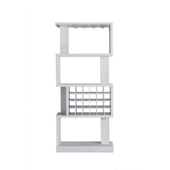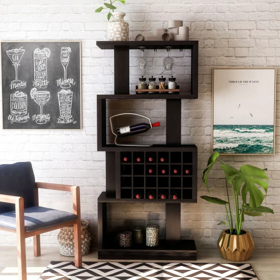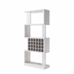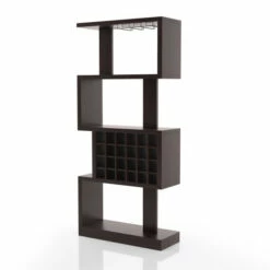 This fabulous modern Bar Cabinet and wine stand offers versatile utility with an extra dose of personality that’s ideal for a casual modern space. It offers a staggered, linear design that creates an eye catching visual and can be utilized as a room divider as well. The multiple shelves accommodate 24 bottles of wine and shelves for essentials. Hang your wine glass collection on the built-in glass racks to complete your full service bar.