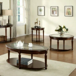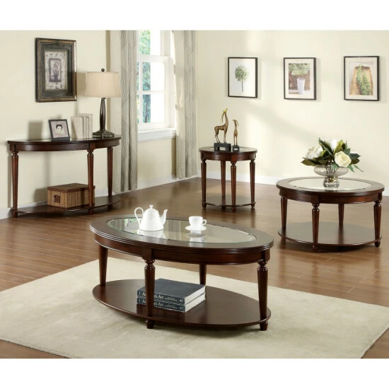 A solid wood construction, with wood veneers, renders a solid, sturdy piece saturated with a gorgeous dark cherry finish to add a dramatic impact. Its oval silhouette is especially enticing. Post legs with turned accents taper, as they join a slender shelf perfect for displaying your favorite things, as a thick beveled glass center insert refines a spacious surface.