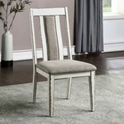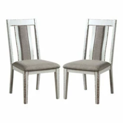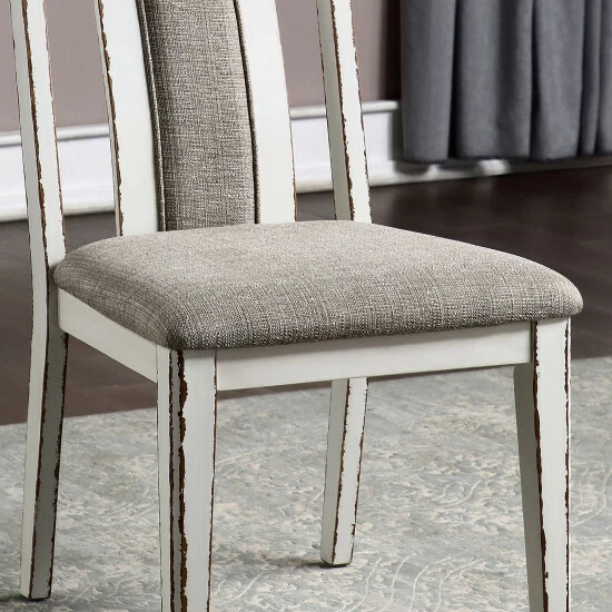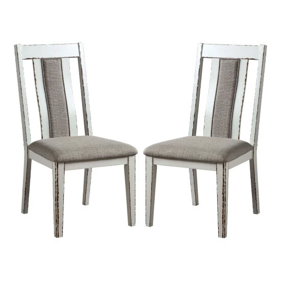 With solid wood legs and weathered white finish, this set of two side chairs is a charming addition to rustic dining rooms. Each chair features a warm grey upholstery with cut-out backrest framing the foam cushion, upholstered in soft but textured fabric.