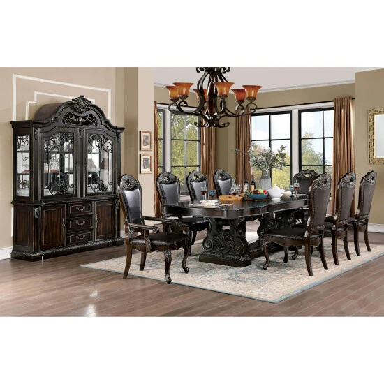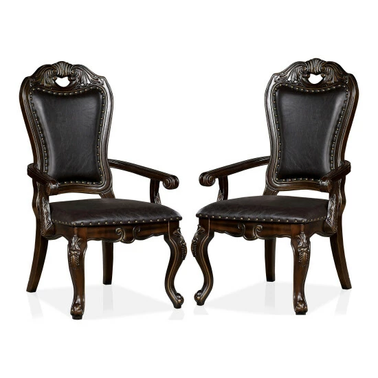 Step into old word luxury with this set of two traditional armchairs. The chairs are upholstered in dark brown faux leather with nail head trim along the fabric. Decorated with cabriole legs and molding accents, this set is incredibly elegant and regal.
