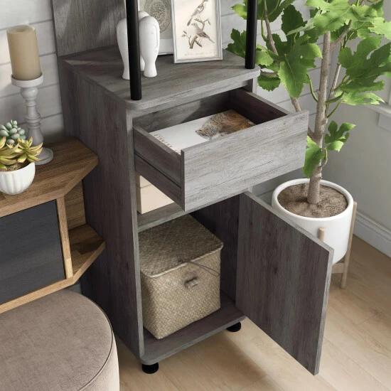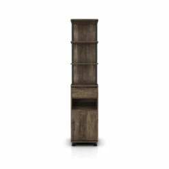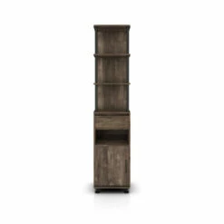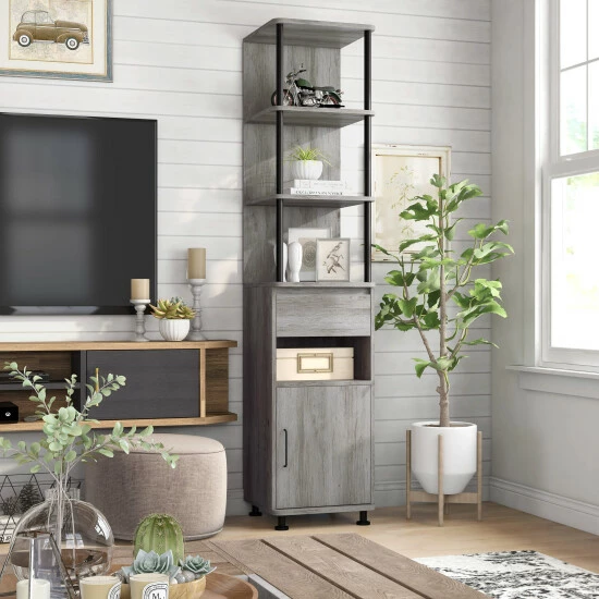 With a compact footprint, this accent bookcase is just the thing to add storage and display in a home office or living area. Displaying charming industrial flair, the bookcase boasts a rustic finish with pipe-style supports and legs. Four upper shelves are ideal for decor. A lower drawer, cubby shelf, and cabinet provide plenty of concealed storage for tucking away accessories and essentials.