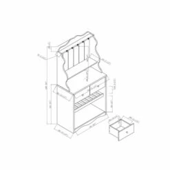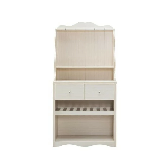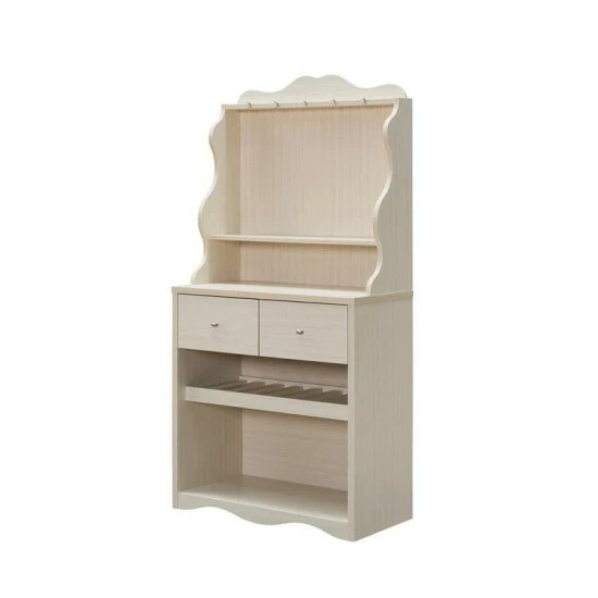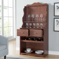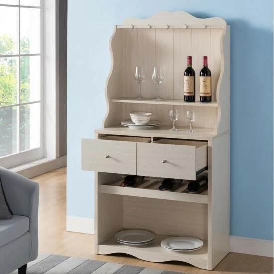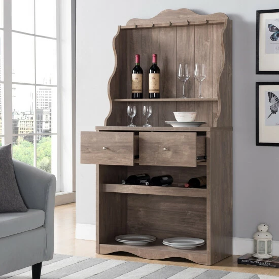 Rustic elements are at the forefront with this beautiful Furniture of America Aore rustic 2-drawer kitchen cabinet. This kitchen cabinet is available in three different finishes and includes five upper hooks that allow you to keep mugs and so much more. The hutch features farmhouse flair in wavy side accents that impart a traditional country kitchen ambiance. That design continues in the crest topping the hutch and in the apron at the base of the cabinet to create a cohesive, charming look.