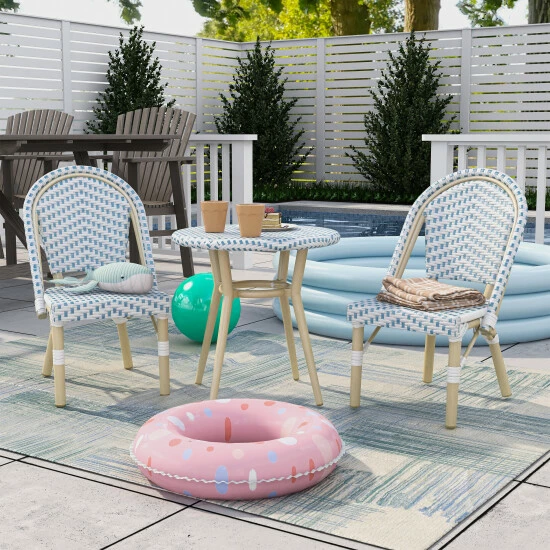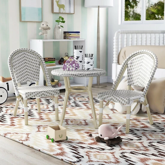 - Includes 1 kids’ side table and 2 kids’ bistro chairs