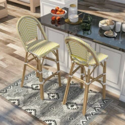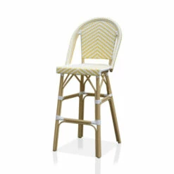Invite the calming ambiance of tropical life into your patio with this set of bar chairs. The aluminum frames are finished in a natural tone for practicality and attraction. A diagonal pattern is created from plastic wicker which is resistant to fading, water, and wear.