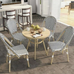 Bring the relaxing sensation of a vacation back home with this 5-piece patio set. The aluminum construction is finished in a natural tone for practicality and aesthetic allure. The tabletop umbrella hole is appended by a base ring to secure shade on a sunny day. The bistro chairs’ diagonal design is made from plastic wicker which is resistant to fading, water, and wear. Enjoy your patio again with this lovely bistro set.