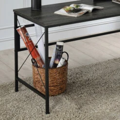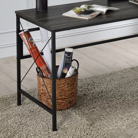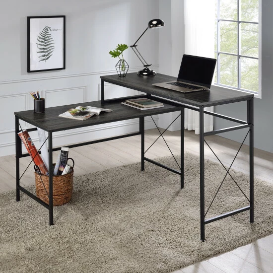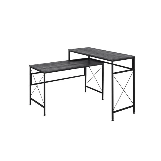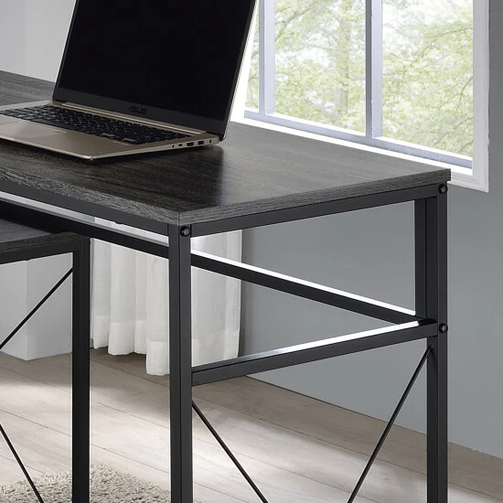 Upgrade the look of your home workspace with the sophisticated style and elegant design of this L-Shaped Computer Desk. With its convened shape, this piece easily fits into corners to reduce its footprint while bringing you a roomy and convenient work des. Designed with an edgy architectural look and sturdy, robust construction to support all your office essentials, this desk boasts no serious shaking or movement for reliable use. The sleek and geometric base ensures a sturdy work environment all while providing an open and airy work to your office. Finished in distressed grey with a black base, this piece is bound to bring essential style to your work environment.