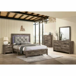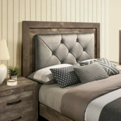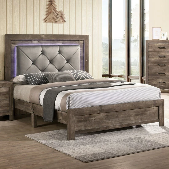 Bring a Rustic country vibe to any bedroom with this panel bed from the Ashland collection. The rough faux wood finish highlights the wood grain and is accented with metal rivets on the side panels. The high profile headboard features a padded fabric, button tufted panel outlined by subtle LED lighting.