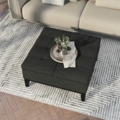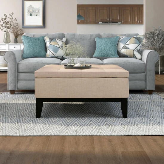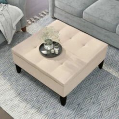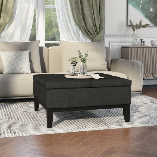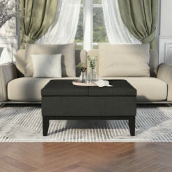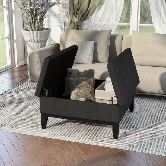 This button-tufted linen-upholstered ottoman is a convenient add-on to any shared space. It serves as a footrest, extra seating, and storage! With a split lift-up lid, you can conceal extra blankets or family games. The black finished tapered legs are eco-friendly rubberwood.