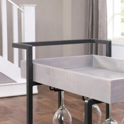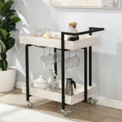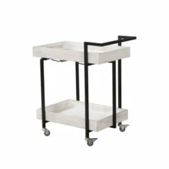 Find joy at the end of the day and invite loved ones to appreciate one another’s company. This serving cart welcomes guests in your home by offering food and drinks of comfort. Snacks and bottles find security on this buffet cart as it has two tray-inspired lipped shelves. The antique finish is a modern rustic style that lends to fashionable comfort. Its casual design makes it perfect for any contemporary home. Steel construction ensures a sturdy and durable cart. Caster wheels add convenience when hosting larger gatherings that require attention in multiple rooms. They also hold practical on daily use when preparing dinner for the family. Quick and easy mobility of bread baskets, entrees, and side dishes in one trip makes serving family dinners much easier! The wheel locks add utility to the already helpful serving cart. Park the tray next to the dining table or anywhere in the house during a party.