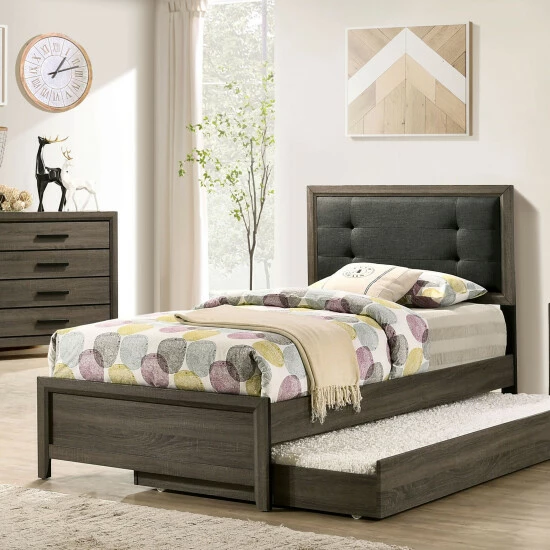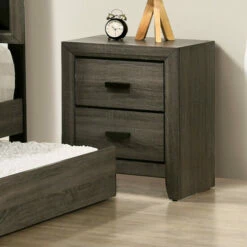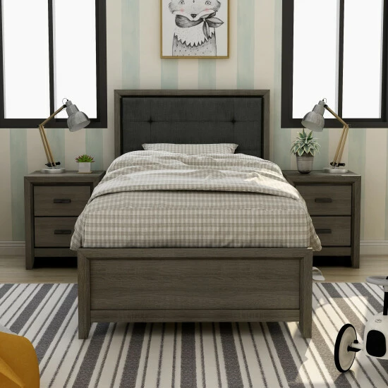 Make any bedroom look extra cozy with this stylish, gray bedroom set. The simple, straight headboard is comfortably padded for an inviting look and feel. The two nightstands are each equipped with two spacious drawers for convenient access to bedtime essentials.