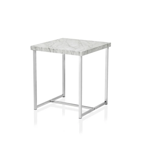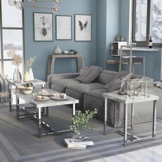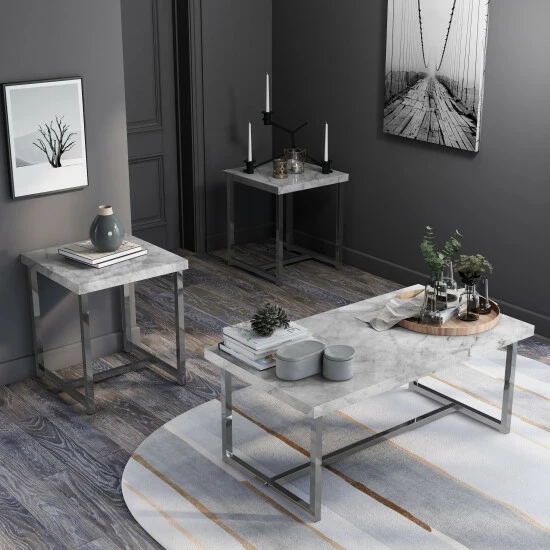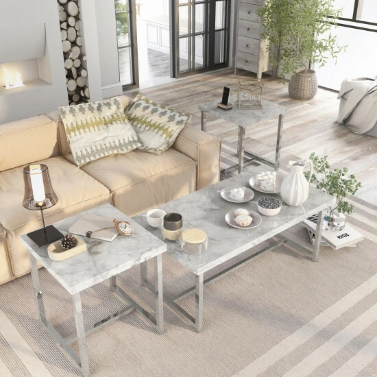 Adore the allure that this chrome and white faux marble coffee table set gives to your living space. The three-piece set comes equipped with a coffee table and two end tables. The metal bases are crafted in an open design for an open and airy appearance.