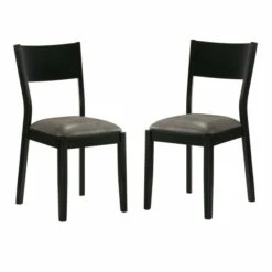Blending mid-century with contemporary style, this set of two dining side chairs lends a refined sensibility. Simplicity rules the day with angled backrests and gray faux leather seats paired with tapered legs and a classic black finish.