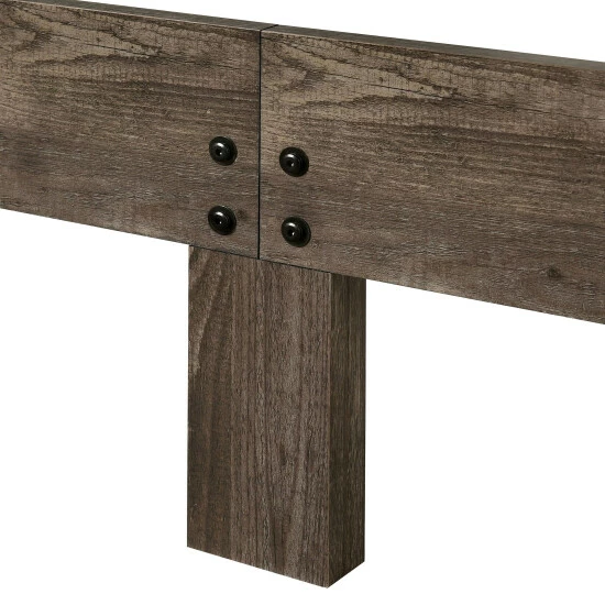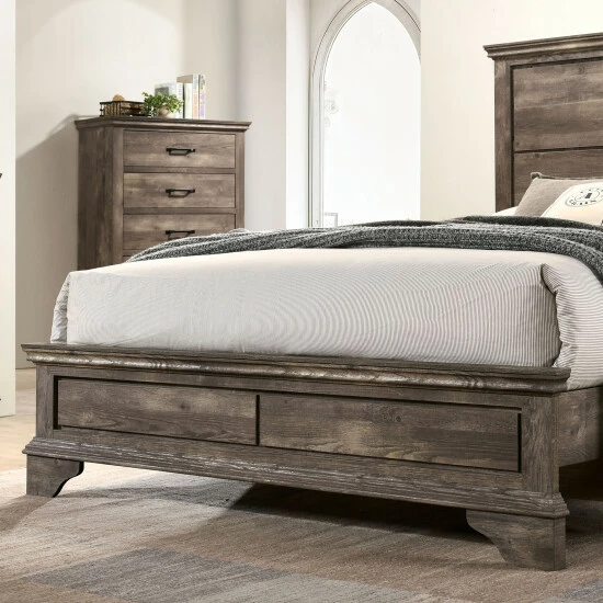 Accent your bedroom with the charm of this grey platform bed, an alluring addition that adds a rustic touch. Bracket feet supports the bed while a solid panel headboard boasts crown molding at the top.