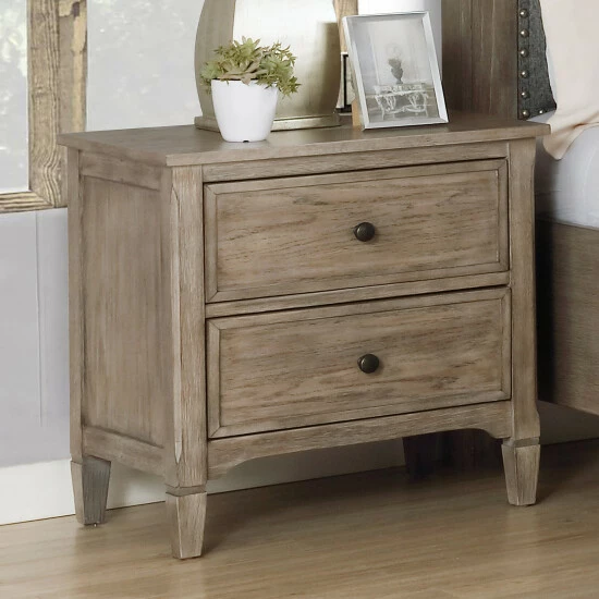 Elevate your bedroom style with this wire brushed warm grey transitional nightstand on tapered wood block legs. Two drawers, including felt lined top drawer, offer ample storage for bedside essentials, and built-in USB outlet to stay charged. Explore all of the pieces of the Banister collection to complete the bedroom of your dreams!