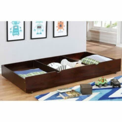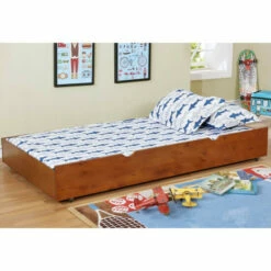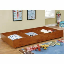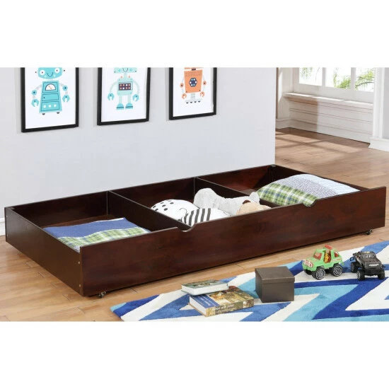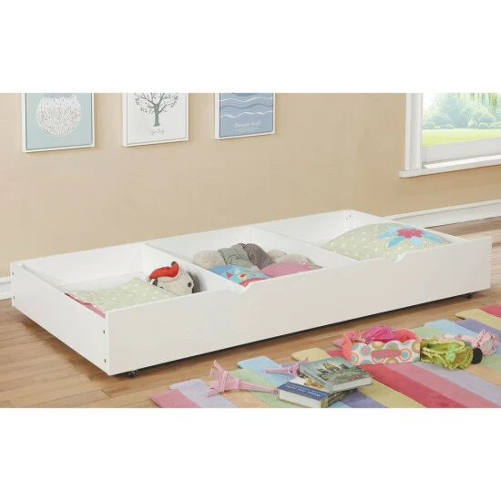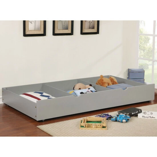 The Furniture of America Bays Twin Underbed Trundle/Drawers is designed to offer extra sleeping space for guests at a moment’s notice. This durable piece features cut out handles for easy grip and a simple wooden frame, allowing you to style it with many different types of bed designs. Available in a variety of colors, there is no shortage on options to enhance your youth’s bedroom with extra sleeping space and improved style. This versatile trundle is not only used as a bed, it can be converted to under the bed storage drawers using dividers. The dividers create three compartments for clothes, toys or other storage needs.