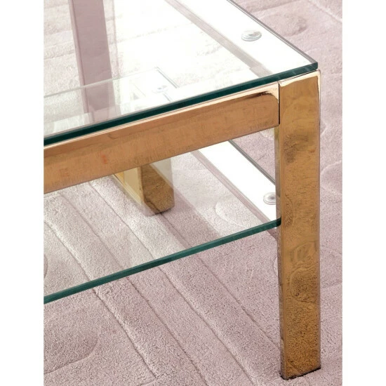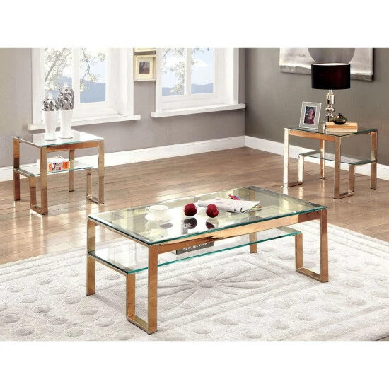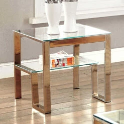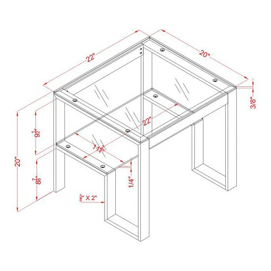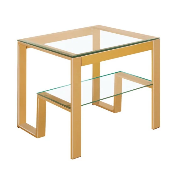 A structure built with modern inspiration, this end table provides both style and function. The metal framework is beautifully designed to emphasize the tempered glass surfaces while enhancing the many angles.