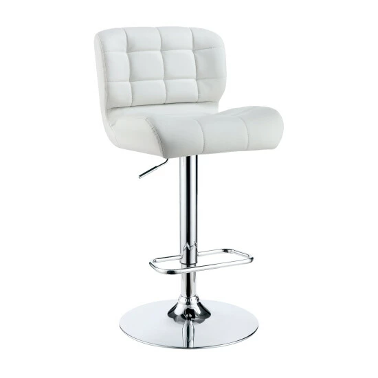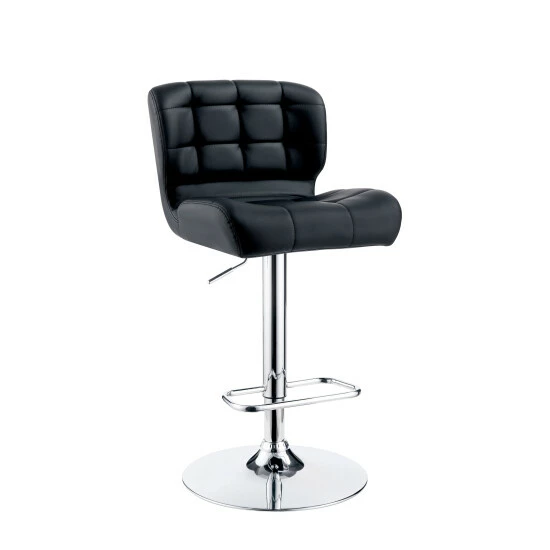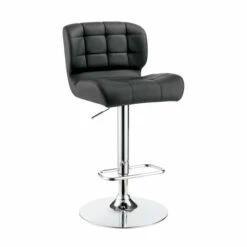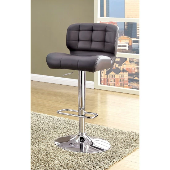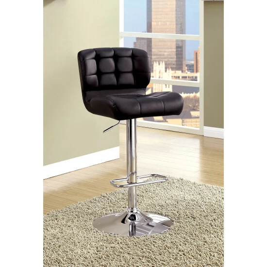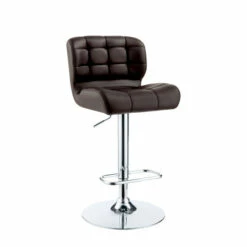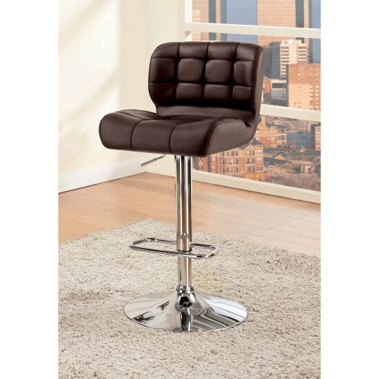 Simplify a modern space with a seating unit prepped for capturing attention and offering comfort. The Beas contemporary swivel bar chair maintains a low-key essence while offering eye-catching finishes and materials. This retro-inspired bar chair borrows from a barbershop motif to deliver straightforward elegance on a chair that swivels with easy 360-degree movement. Its lustrous chrome finish metal frame features a ring footrest and wide, round disc-shaped base. Sit in supreme comfort on a low-back, generously foam-padded seat covered in tufted faux leather upholstery. Adjust height settings with a pneumatic gas lift system. This dynamic swivel bar chair from Furniture of America quickly becomes a house favorite. Choose from color options that customize your tailored space.