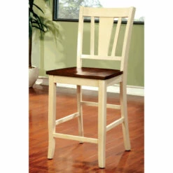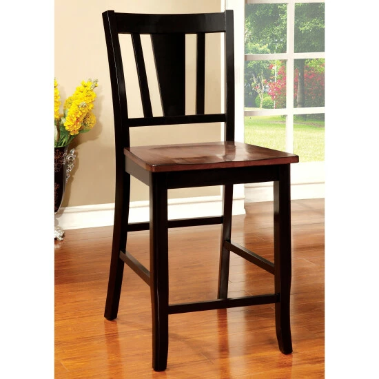 Enhance the look of your kitchen, breakfast nook, or dining room with this set of two transitional counter-height dining chairs from Furniture of America featuring clean, crisp lines. Each chair is constructed from solid wood fashioned in a handsome finish that makes up the bulk of its appeal. Each one also features a contoured wood seat for an experience that’s both stylish and comfortable. You’ll enjoy resting against arched backs built in a handsome slat design, sturdy tapered legs that are flared in the back, and handy footrests, all coming together in a set of chairs that enhances every aspect of your dining comfort.