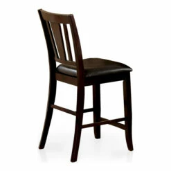 This set of two transitional counter-height chairs adds a stylish look to any home. Each is crafted with faux leather upholstery and wood legs in an espresso finish for an elegant look. The solid block legs taper in the front and flare in the back for added stability and style. The seat is cushioned for comfort, while the curved back features a slatted design, with handy leg rests for added convenience.