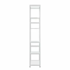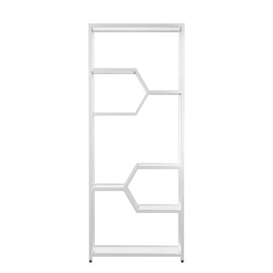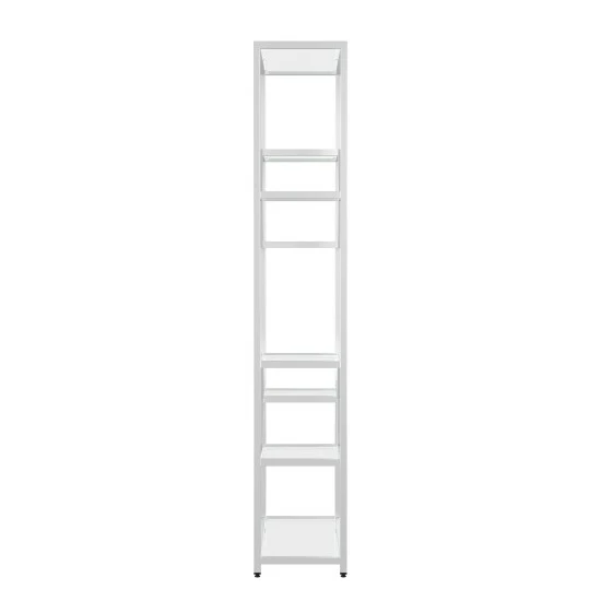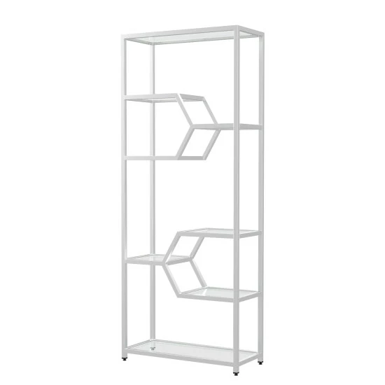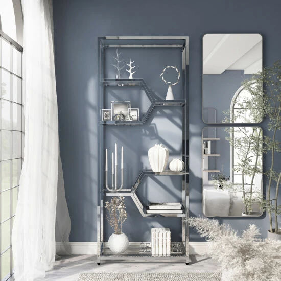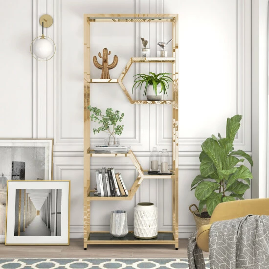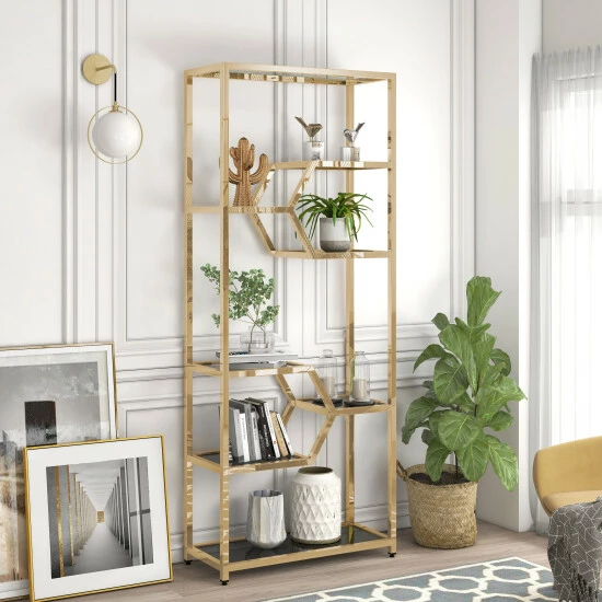 Update the look and feel of your living space with this contemporary 7-shelf bookcase from Furniture of America. It features a sleek steel frame with a geometric-style motif in your choice of chrome and clear or champagne and black. Six open tempered glass shelves in various tiers provide plenty of storage or display space for plants, picture frames, and more. Expansive open bottom tempered glass shelf offers additional storage or display space.
