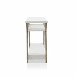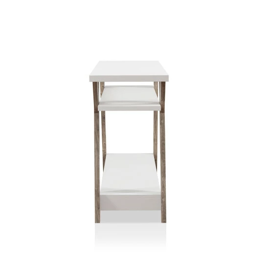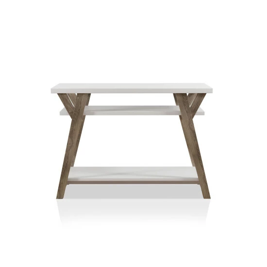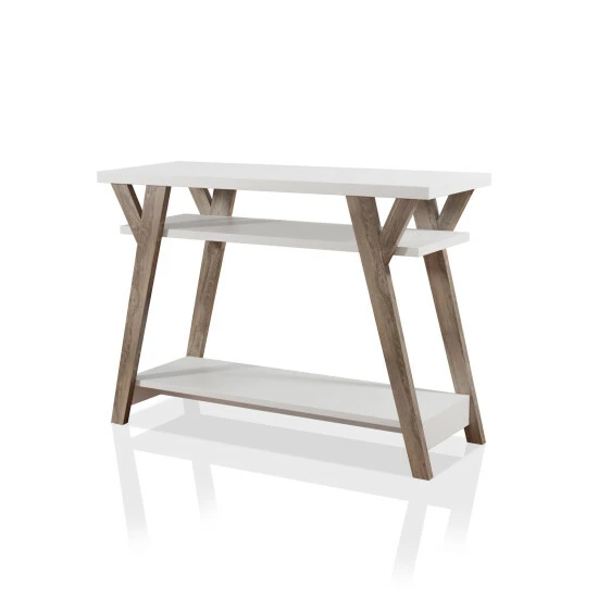 Showcase family photos or decorative items on this Farmhouse inspired console table by Furniture of America. The distressed oak finish on the Y-shaped legs pair beautifully with the white shelves to accent the rustic charm of your living space. Crafted with an open side and back design for character, this console table features two large shelves for storage and display. Its slim design makes it perfect for placement in narrow or small spaces. This table, from the Bima collection, can function beautifully in a front entryway to collect keys and mail, or in an upper hallway to hold a lamp and decorator items.