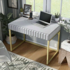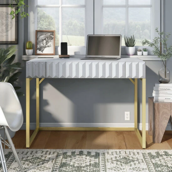 The unexpected design of this two-tone desk adds a retro vibe to your home office. A hidden drawer on smooth metal glides flaunts a 3D facet while built-in USB ports and outlets charge all devices from laptop to phone and speaker to lamp. Atop a gold-finished steel frame, this office desk serves a vogue look.