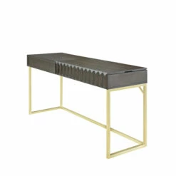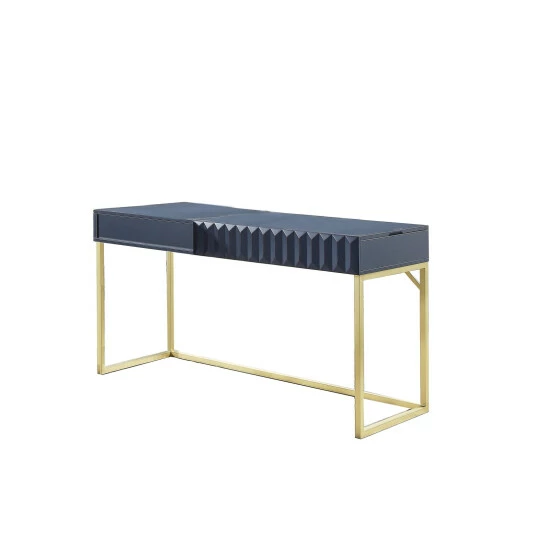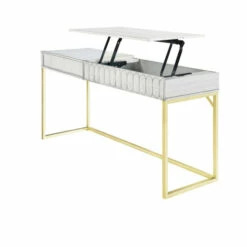 The unexpected design of this two-tone desk adds a retro vibe to your home office. A lift-top has dual-purpose as a standing desk and as a place to store items. 3D front-paneling is flaunted on a gold-finished steel frame.