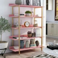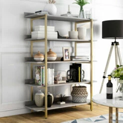 For an extra pop of glam, add this gorgeous light walnut shelving piece to your home and create a beautiful display area. Crafted by Furniture of America for the Bizi collection, this piece provides plenty of storage space. Its five open shelves create a spacious surface to sort and organize memorabilia, books, and collections. The open structure is a versatile design that will allow this piece to stand with a wall or on its own. A small raised surface behind each shelf adds dimension and additional support for your decor. You’ll adore its straight legs, finished in a striking gold color for an eye-catching shelving unit.