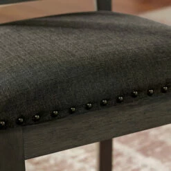 A blend of beautiful materials with handsome grey tones make up the style and design of this set of two transitional counter height chairs. Each chair also offers padded seats, wrapped tightly in a dark charcoal grey fabric and are lined with classic nailhead trim that nicely complements the warm grey wood grain finish. With a cross back seat, you can lean back comfortably as you dine with family and friends over dinner. Square, tapered legs on the front and flared legs in the back finish up this fashionable, yet practical set of chairs that work wonderfully at a dining table, kitchen counter, as well as a home bar.