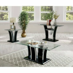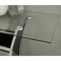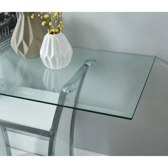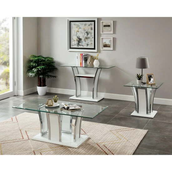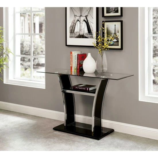 Crisp, clean lines and sleek, subtle curves blend beautifully together to form the magnificent design of this contemporary sofa table from Furniture of America. Impeccably crafted with an 8mm tempered glass top, this sophisticated and modern sofa table infuses any living space with cool, casual glamour. Vibrant chrome trim accents the curved, sweeping sides of the glossy, lacquer-coated legs, beautifully offsetting the rectangular base and rectangular beveled glass top. Available in your choice of two modern finishes of rich, glossy black or crisp, glossy white, this exquisite, contemporary sofa table is sure to bring a bold, beautiful modernity to your living room decor.