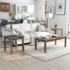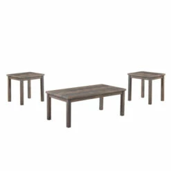 Impart a natural touch with this three-piece wood finish living room table set. Designed to create a cohesive look in your living room, the set includes a rectangular coffee table and two end tables. Surfaces boast a rustic natural finish with engaging wood grain accents that add a hint of dimensionality. Perfect for a casual den or inviting family room.