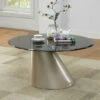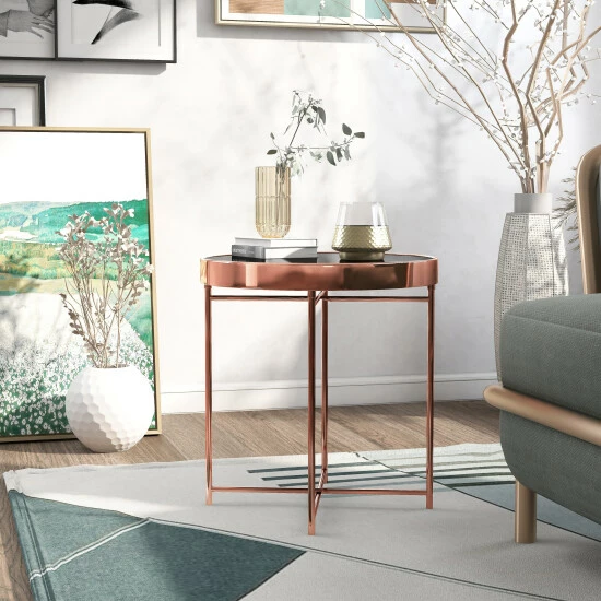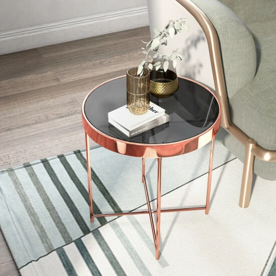 This stunning two-tone end table boasts a bold round structure with a delicate frame for a look that is beyond compare. The Furniture of America Bola Contemporary Gold Metal Round End Table is a stunning addition that bring a glamorous touch to any sitting area. Artistic cylindrical legs create a light, delicate look and are beautifully finished in rose gold that lends richness and warmth to modern or mid-century decor. Consider placing it in a refined guest suite nest to the bed, or in a compact entryway where it sets the tone of your stylish decor. Its black glass tabletop complements a multi-purpose piece that is as functional as it is beautiful.