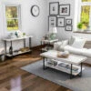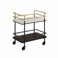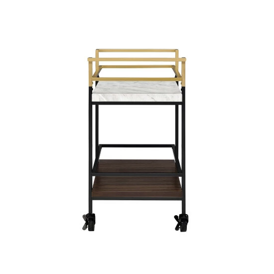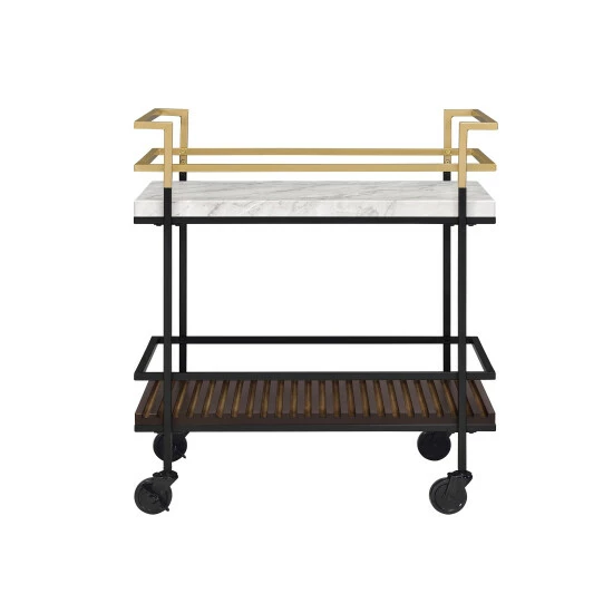 Urban chic presents unexpected style on this mixed material serving cart. Gold-coated handles merge with a black metal frame. Likewise, the faux marble top shelf contrasts the slatted walnut lower shelf.