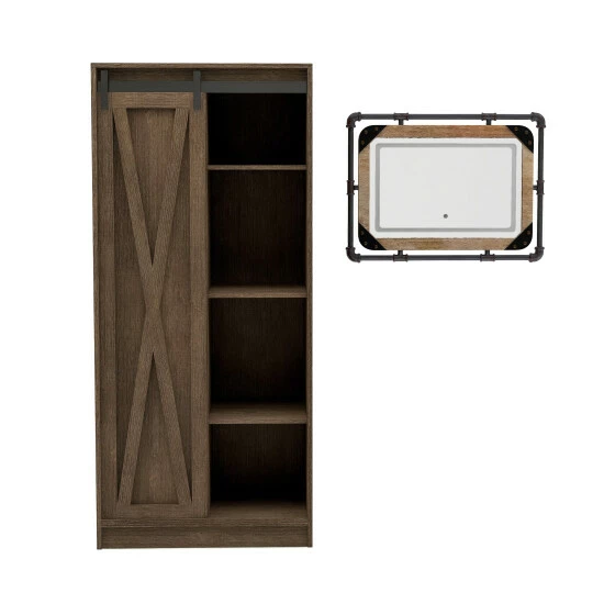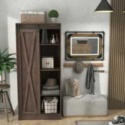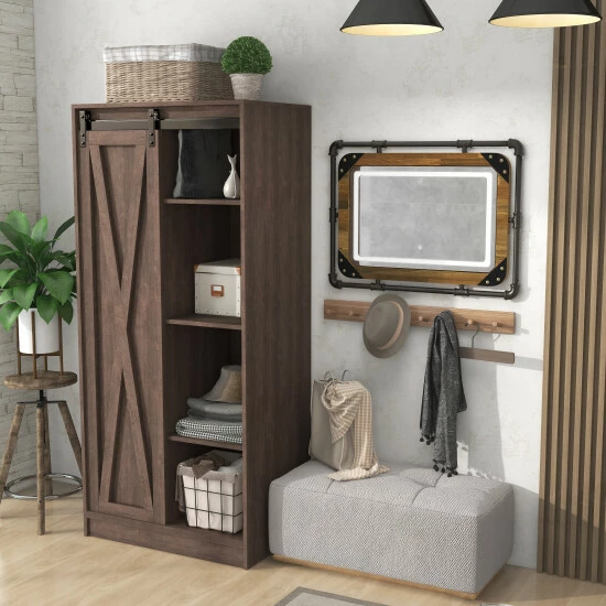 Update your bedroom or create a mudroom with this armoire and mirror set. A barn door and pipe metal frame come together to create a rustic appeal. Use the armoire as a coat closet and the touch-activated LED mirror as last-minute spruce up when heading out the door.