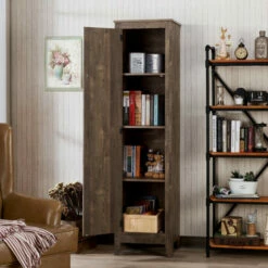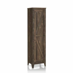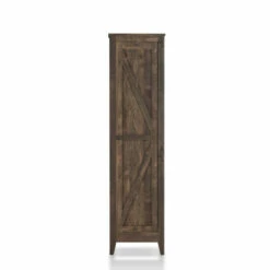 Enjoy the beauty and simple charm of the classic Farmhouse style with this Furniture of America Bres Rustic Bookcase Cabinet. This bookcase has a reclaimed oak finish full of character and individuality. Four shelves provide storage that is concealed by the beautiful barn style cabinet door. This bookcase can be used alone or combined with another piece to make a larger cabinet. This storage cabinet is well suited to the living room for storage and display of books and decor items when left open, or the kitchen for that extra set of dishes or a cookbook collection. Placed in a bedroom or entryway, the storage possibilities are endless with this versatile and charming cabinet.