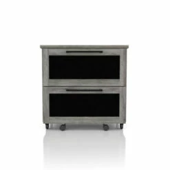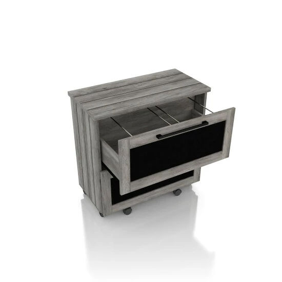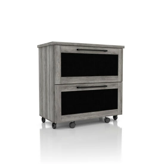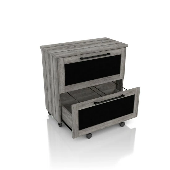 Rustic attraction takes grasp of this filing cabinet with its vintage grey oak finish. The plank-style tabletop and side paneling advance the country charm upon the industrial black metal bar pull accents. Chalk cabinet door fronts allow you to label what the contents are and mark them with a date. The two large drawers offer four file frames to section off your folders. Four caster wheels enable effortless movement throughout the office, saving you time when rearranging your home office setting.