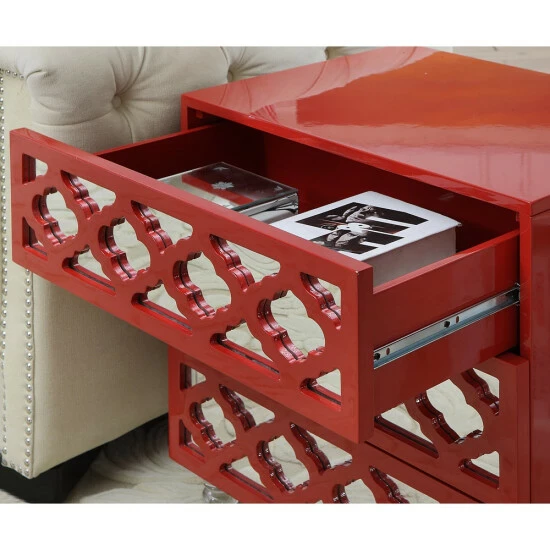 Glam up your living room or bedside manner when adding this modern Brey side table from Furniture of America. Glass panels steal the show with its attractive Moroccan inspired overlay. Sturdy acrylic legs and a glossy finish lighten the mood in your living area, providing an airy and fashionable feel that all guests will notice. When you need to organize your living area, three spacious drawers with metal glides ensure easy access to books, tablets, and cell phones. This piece is perfectly crafted with veneer and wood, with clear tapered legs providing support and another level of exceptional visual interest.