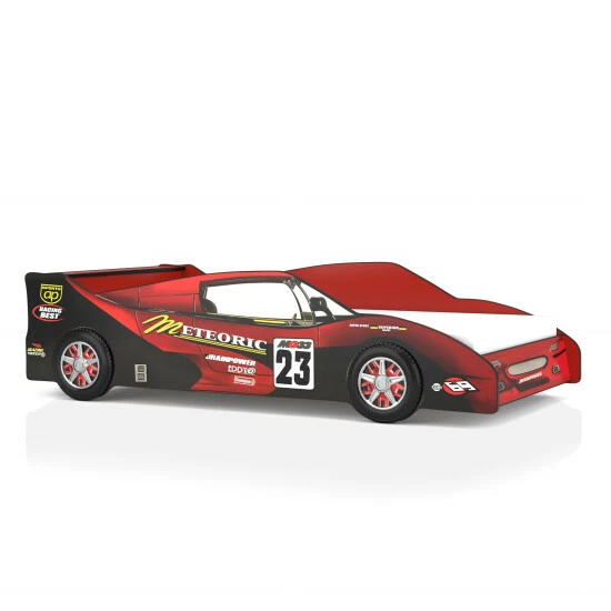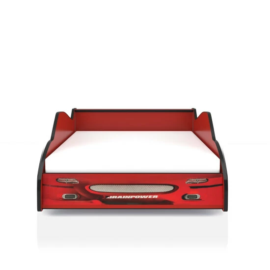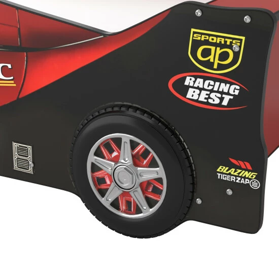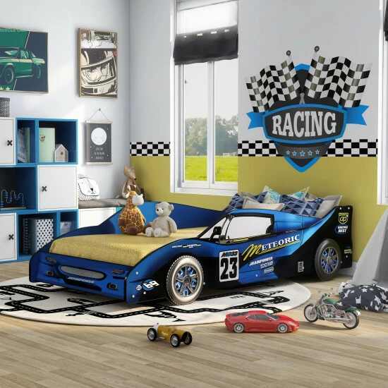 Encourage your child to settle into bedtime with this racecar-designed twin bed. The alluring frame replicates a racecar with sponsorship decals and wheel rim details. Its metal support structure with included slat kit is a sturdy build, able to hold all your child’s dreams.