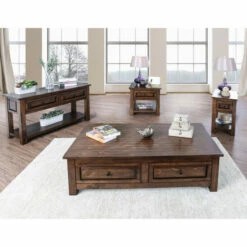 A classic look with farmhouse charm stylizes any space when the Caen sofa table is in the mix. Delivering a rich, solid look and ample style, this rustic wood sofa table hits the mark for both function and fashion. This sofa table from Furniture of America becomes an integral part of a family entertaining space or living room with its sleek, solid wood build and warm walnut finish. Wood grain accents embellish an earth-inspired vibe. A spacious cabinet design over an open shelf features two storage drawers that hide incidentals out of sight and a shelf for additional display room. Ornate carved detailing adds dimension to drawer fronts and side panels, as charming black finish metal drawer knobs wrap up a host of features making this sofa table a perfect choice.