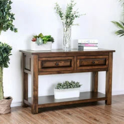 A classic look with farmhouse charm stylizes any space when the Caen sofa table is in the mix. Delivering a rich, solid look and ample style, this rustic wood sofa table hits the mark for both function and fashion. This sofa table from Furniture of America becomes an integral part of a family entertaining space or living room with its sleek, solid wood build and warm walnut finish. Wood grain accents embellish an earth-inspired vibe. A spacious cabinet design over an open shelf features two storage drawers that hide incidentals out of sight and a shelf for additional display room. Ornate carved detailing adds dimension to drawer fronts and side panels, as charming black finish metal drawer knobs wrap up a host of features making this sofa table a perfect choice.
