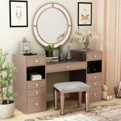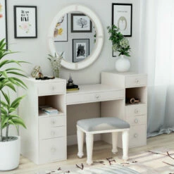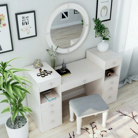 - Includes 1 table, 1 mirror, 1 stool