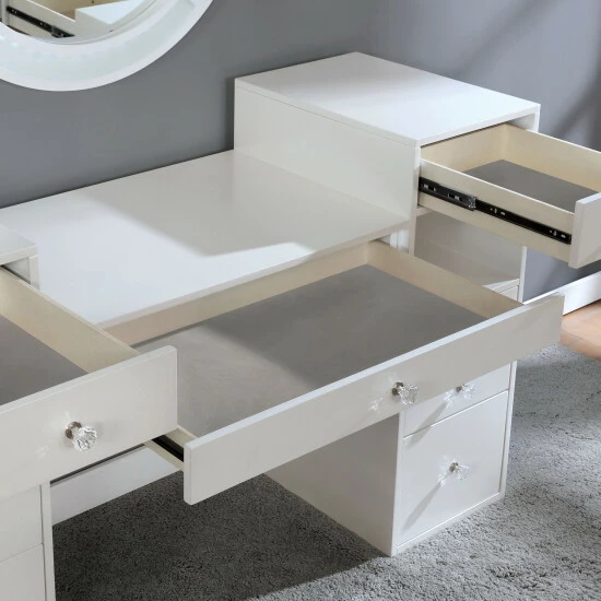 Blend modern amenities with old school style with this gorgeous transitional vanity set from Furniture of America, which features a vanity, matching stool, and LED mirror. Crafted from solid wood and veneer in your choice of two sensational finishes, this vanity set gives your space a bright elegant appeal. The vanity features a multi-level tabletop and a large round mirror lined with LED lights for a movie star appeal. Nine drawers, including a center drawer, with glittering drawer pulls and two open compartments provide functionality and storage, while the stool comes with comfy plush cushion and delicately turned legs that taper. This gorgeous vanity set makes a delightful addition to any bedroom.