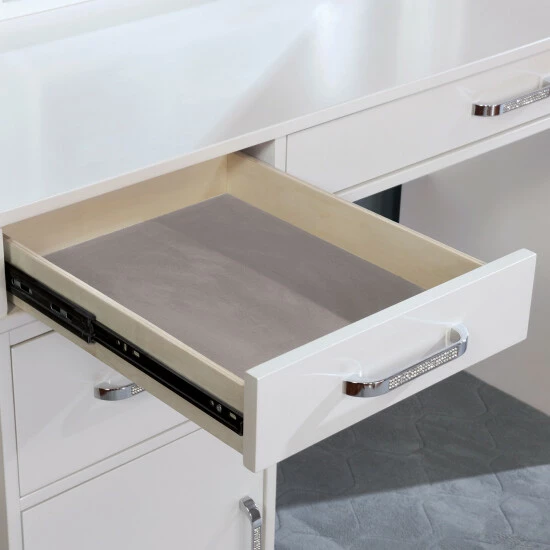 - Nine drawers and two open compartments