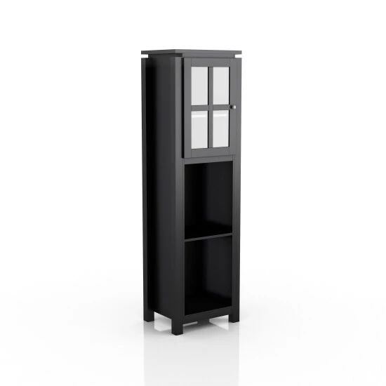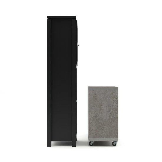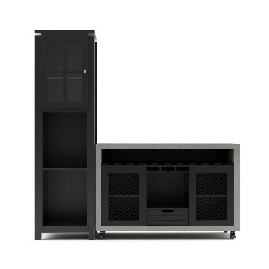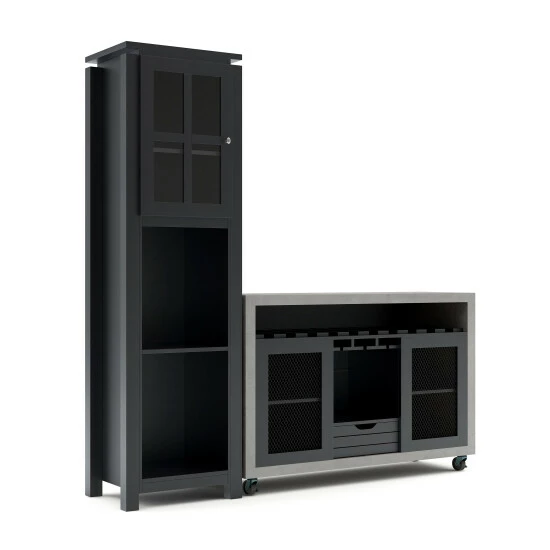 Complete your modern farmhouse-style kitchen or dining room with this bar set. The cement-like bar table cushions the black finish of the tower and wine rack. With wire mesh inserts and a windowed cabinet, country comfort serves a hospitable dining experience.