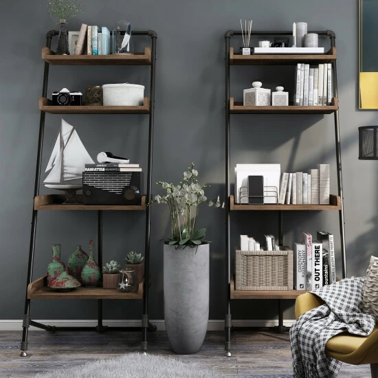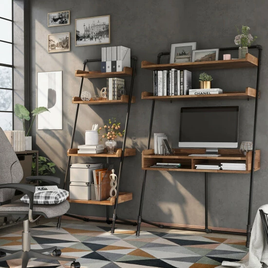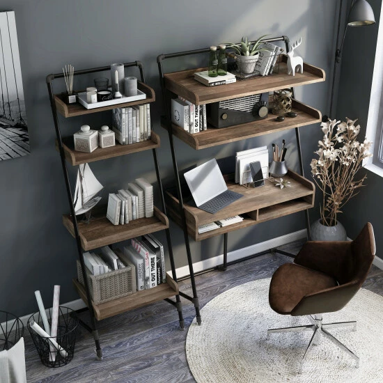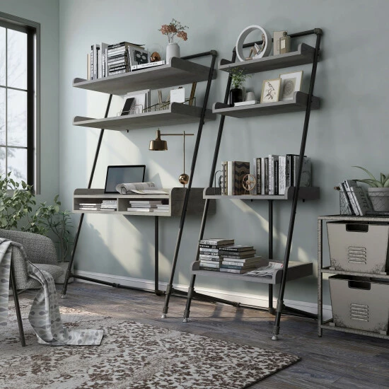 Put together a home workspace that overflows with character and style. This industrial desk and bookcase show off a striking angular design with light, airy shelving that delivers plenty of space for organizing textbooks or showing off professional accolades. The desk boasts two upper shelves with a desktop and two cubbies to create an easy workspace for working or studying. Shelves feature raised lips on three sides while an angular, leaning framework creates flowing movement in your living area, bedroom, or home office.