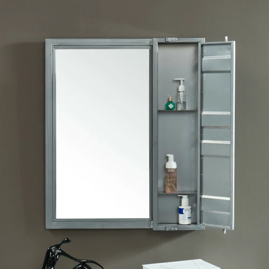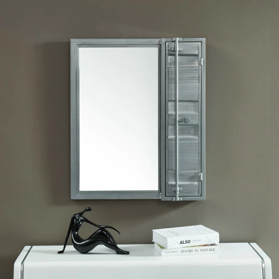 Add character to those blank walls with this eye catching accent mirror with cabinet storage! The pipe details and corrugated metal panels add industrial flair to this wall mirror design.